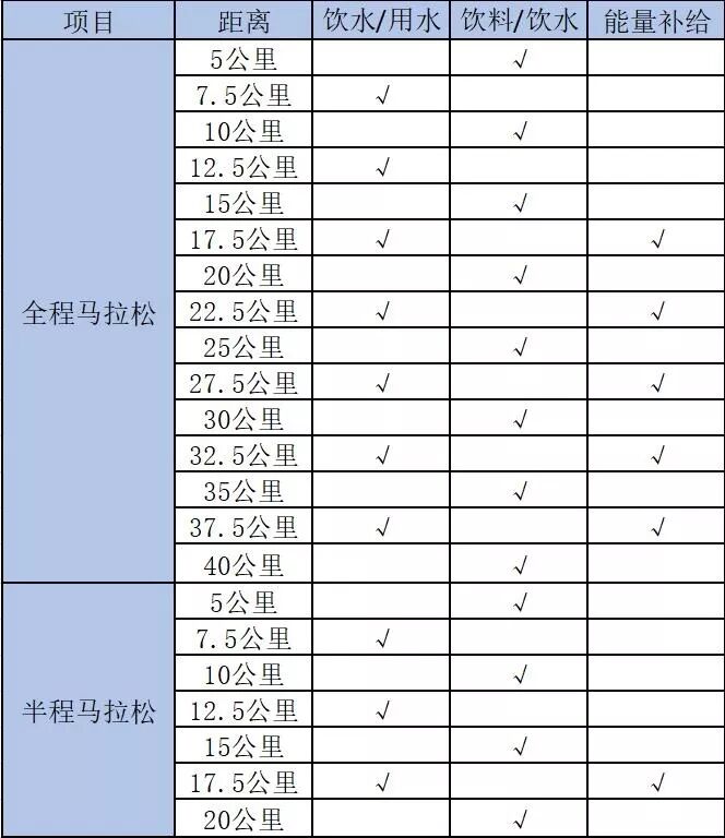 2、能量补给站:在比赛沿途的17.5公里、22.5公里、27.5公里、32.5公里、37.5公里、马拉松终点处设置能量补给站。