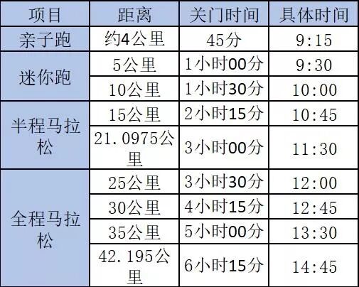 关门时间(以8:30发令枪声时间为准)具体见下表: