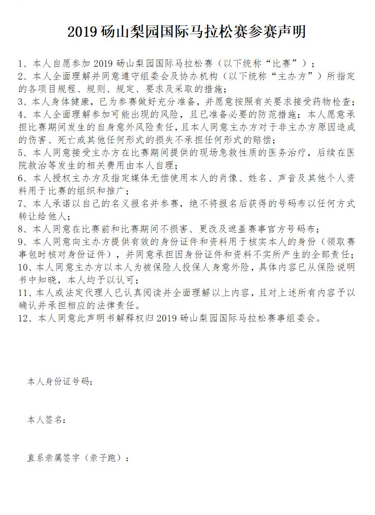 注意事项:所有参赛选手须其现场签署参赛免责声明或自行在官方网站下载组委会公布的免责声明本人签字带至参赛物品领取处,方可领取参赛物品并参加比赛;18周岁以下未成年人报名参加比赛,在赛前领取参赛物品时,须其监护人现场签署参赛免责声明,方可领取参赛物品并参加比赛。